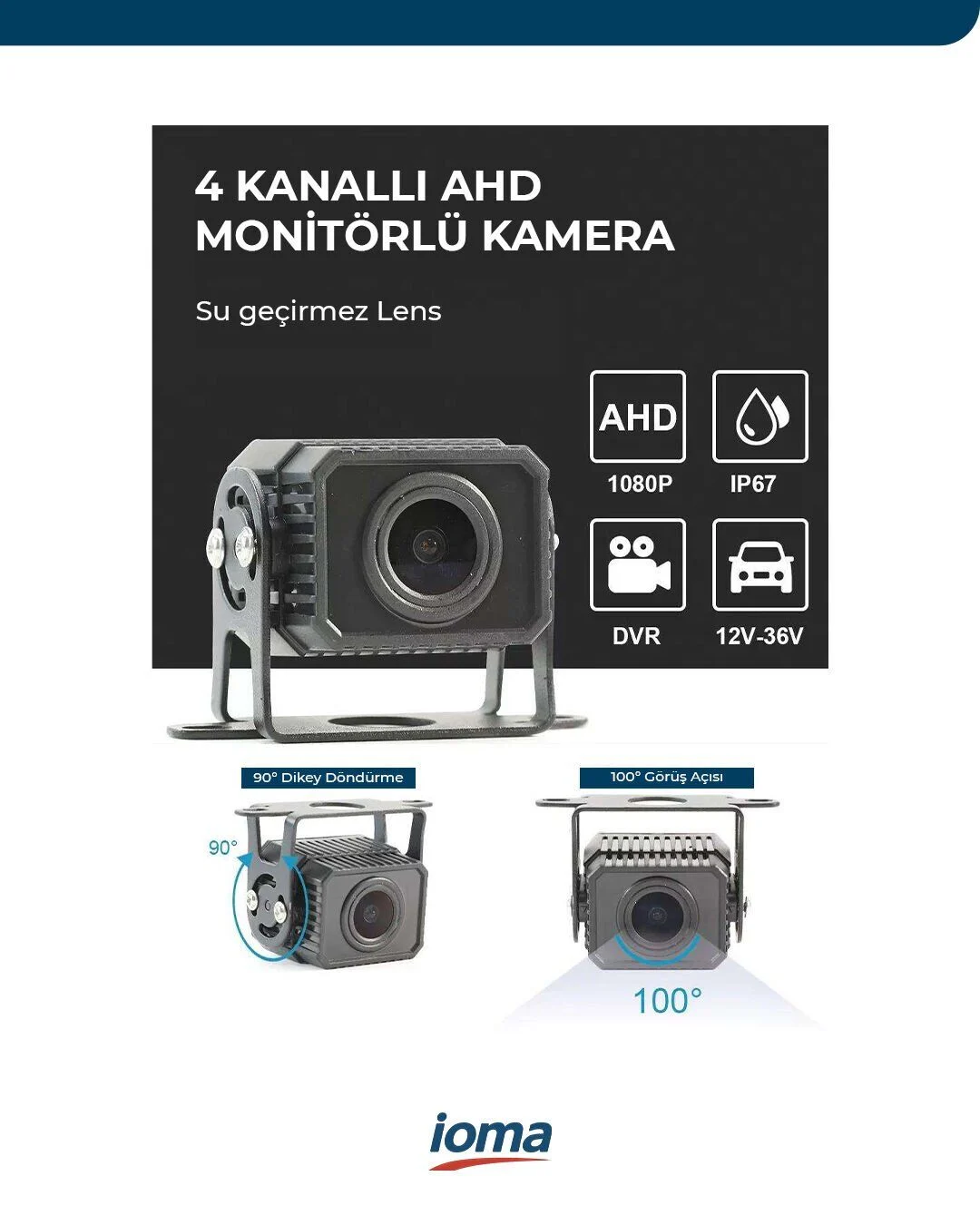 Kamera Uyumluluğu: Tüm Ioma AHD dış mekan kameraları (IP68/IP69K) ile uyumludur.
